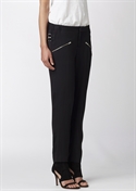 Straight cut trousers with soft elastic sides in waist and strap details on hips. Hook and zipper closening. Fake pockets at back and zipper pockets in front.